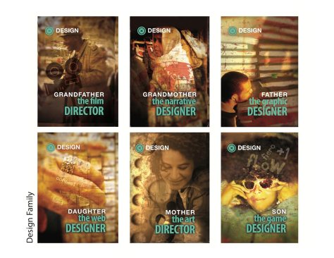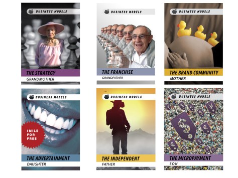 7 transmedia suits, or topic, of 6 family members as personae or characters, or roles (2 grand-parents, 2 parents, a son and a daughter). The goal is to collect and match complete families of 6 and show them to the other players. But, of course, we propose much more… The game works for small and larger groups as players can pair up and change roles along the ride.